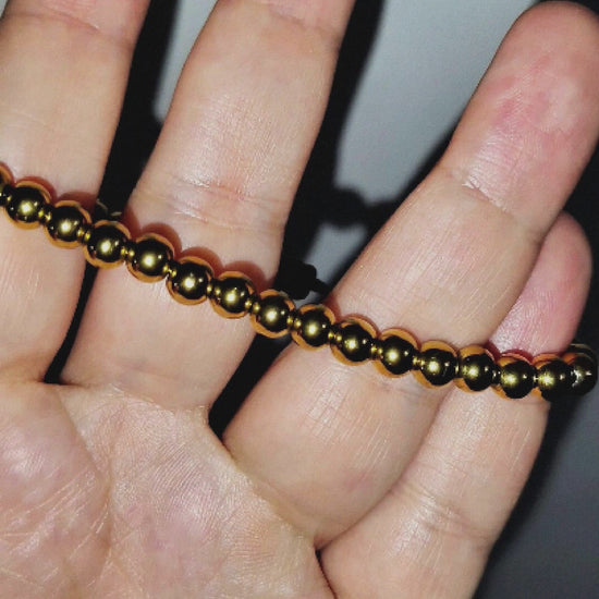 Pulsera tejida con hilo negro y balines lisos en oro laminado 18K. Un diseño clásico, elegante y versátil que combina con cualquier estilo.