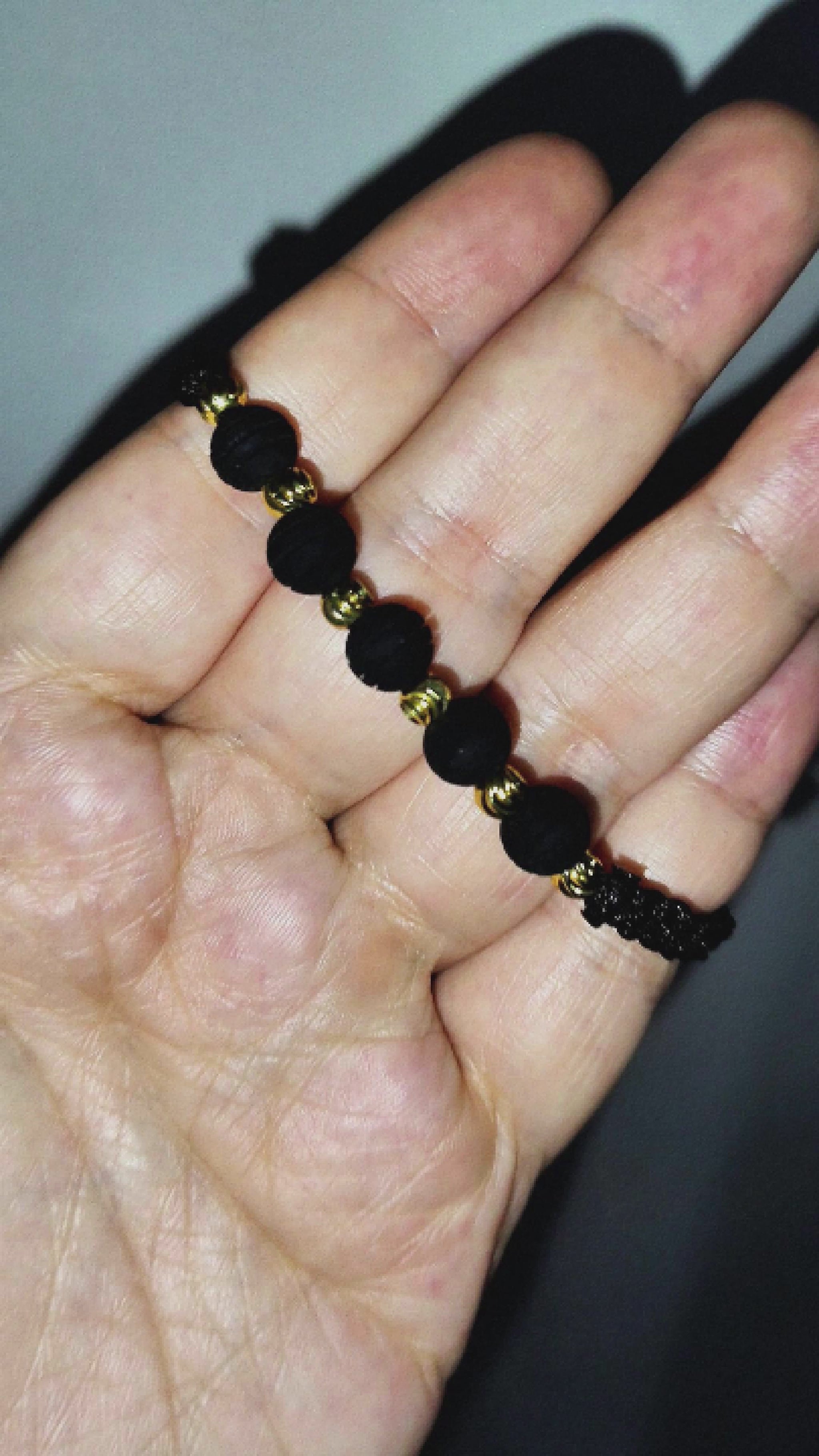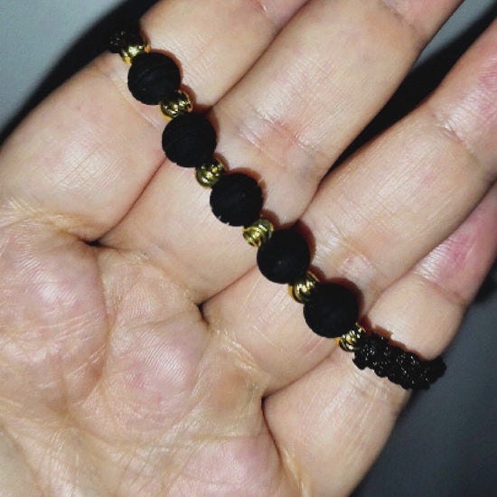 Pulsera tejida color negro con pepas decorativas y balines diamantados en oro laminado 18K. Un diseño moderno, elegante y resistente que resalta con estilo.