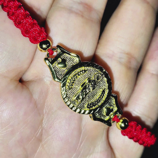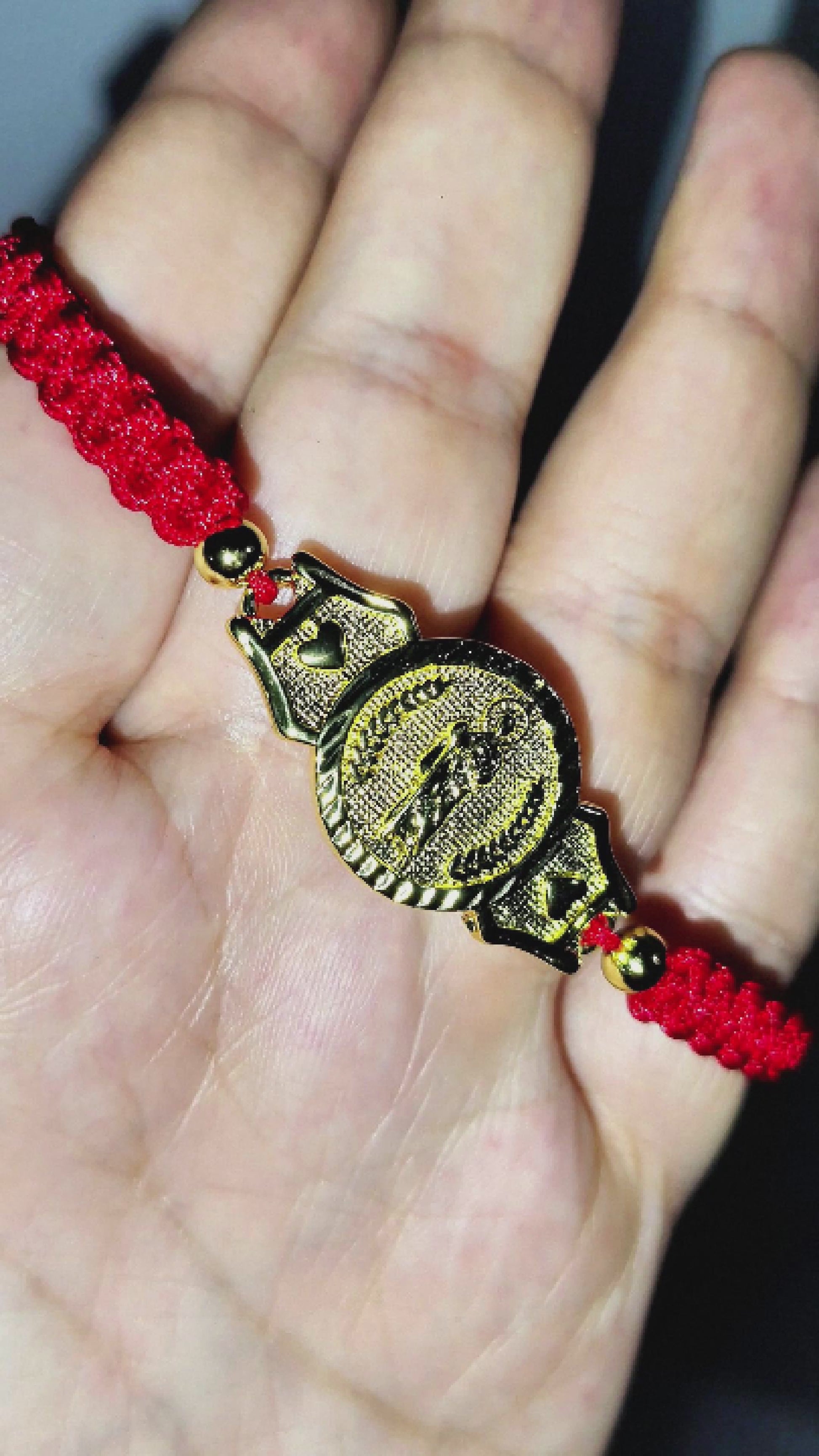 Pulsera tejida con hilo de alta resistencia y dije grande de San Benito en oro laminado 18K. Un poderoso símbolo de protección y estilo elegante.
