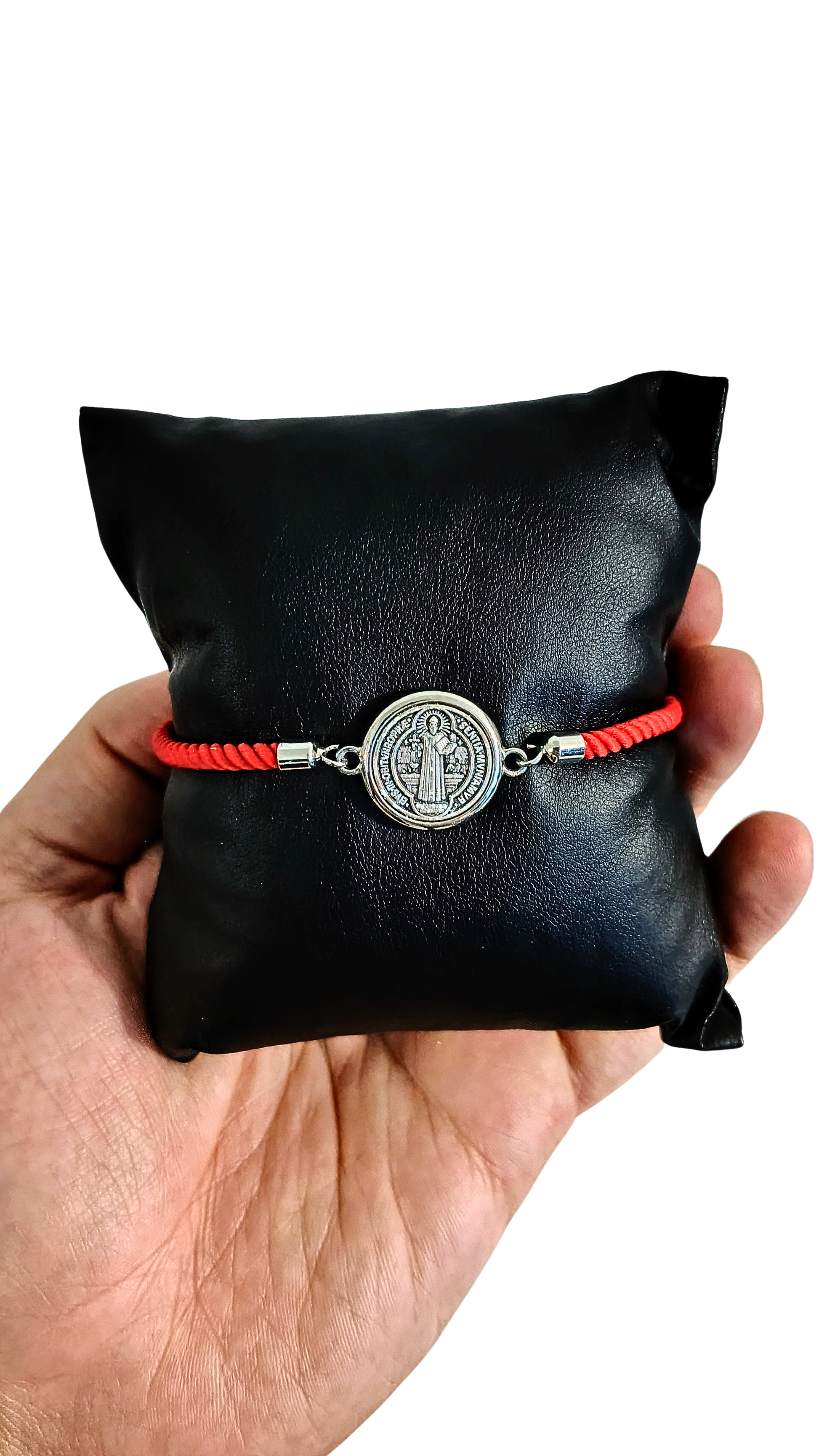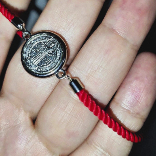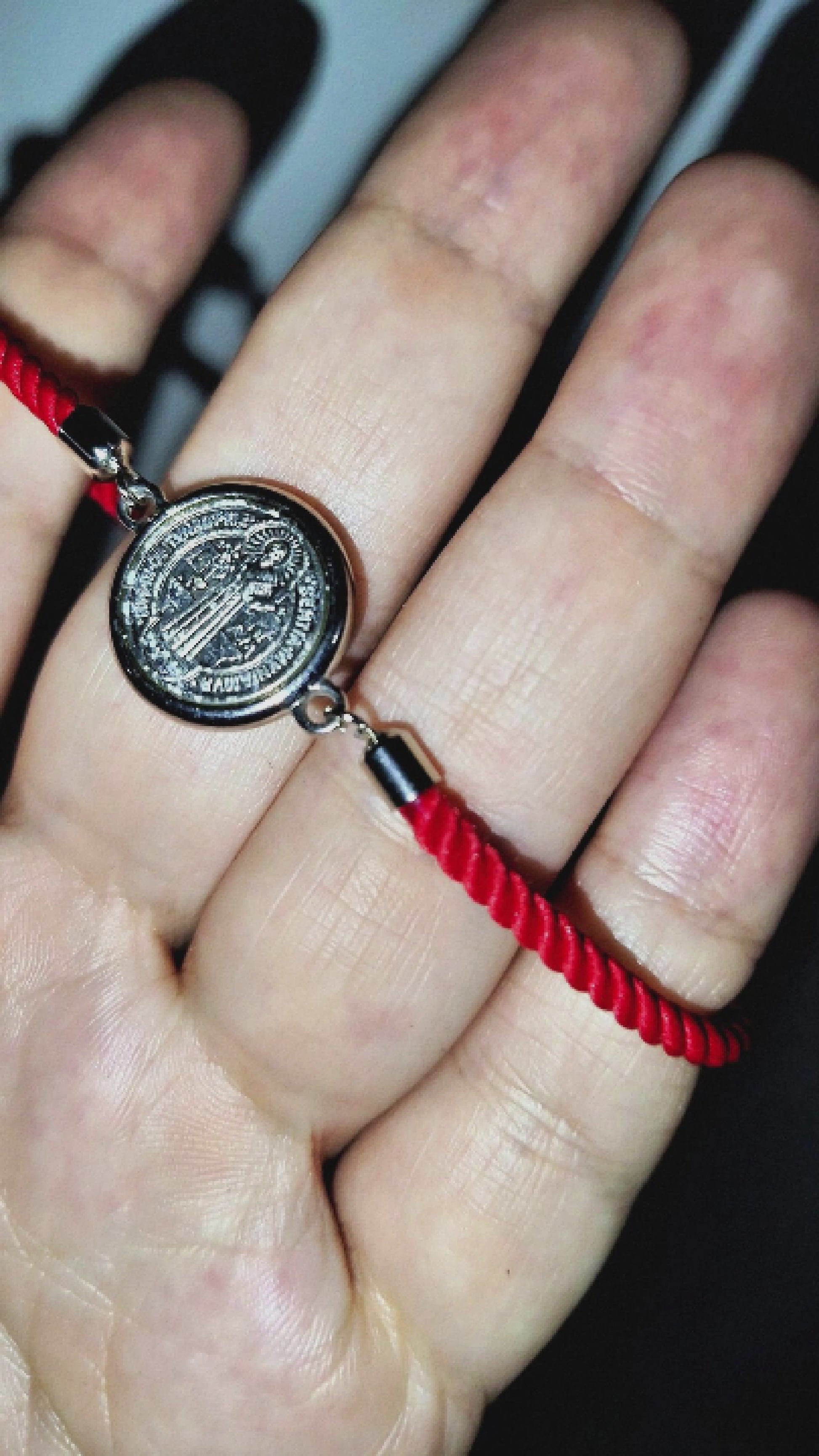 Pulsera tejida en hilo negro con dije de San Benito en titanio. Protección, estilo y resistencia en una sola pieza.