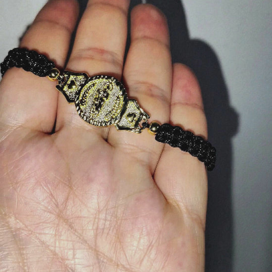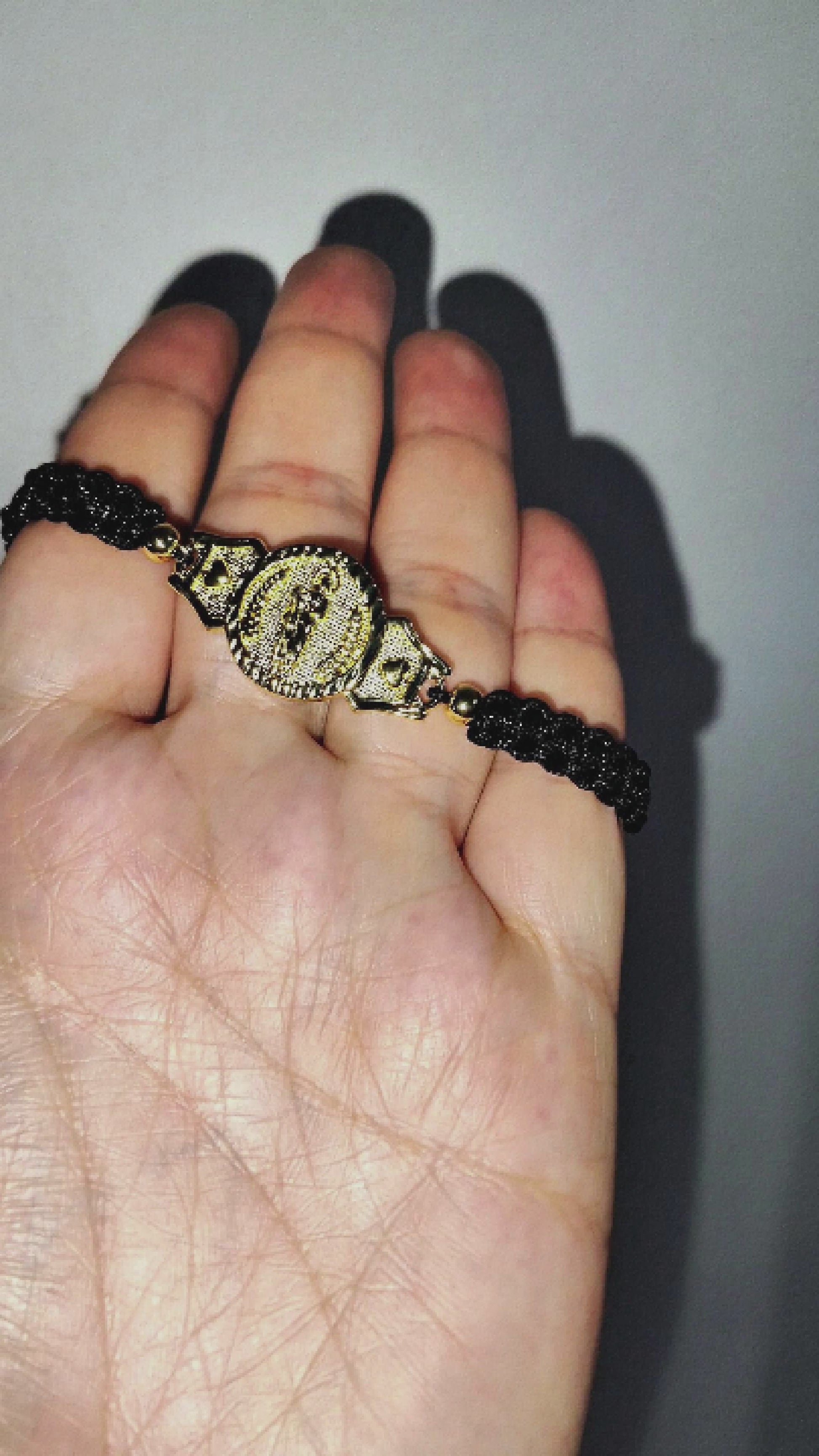 Pulsera tejida color negro con dije grande de San Benito en oro laminado 18K. Protección, estilo y elegancia en una sola pieza.