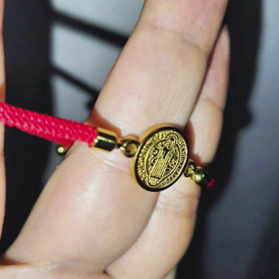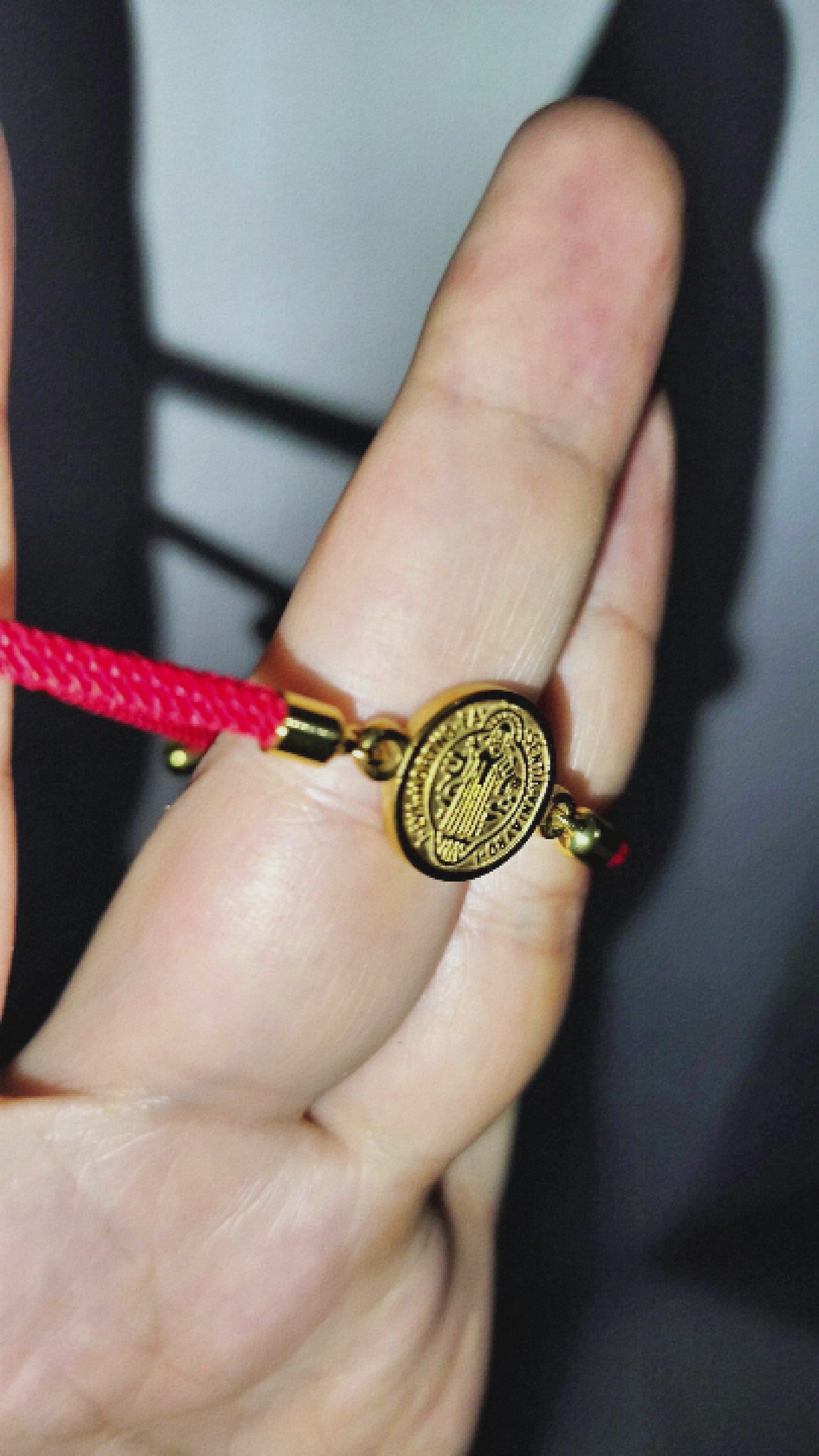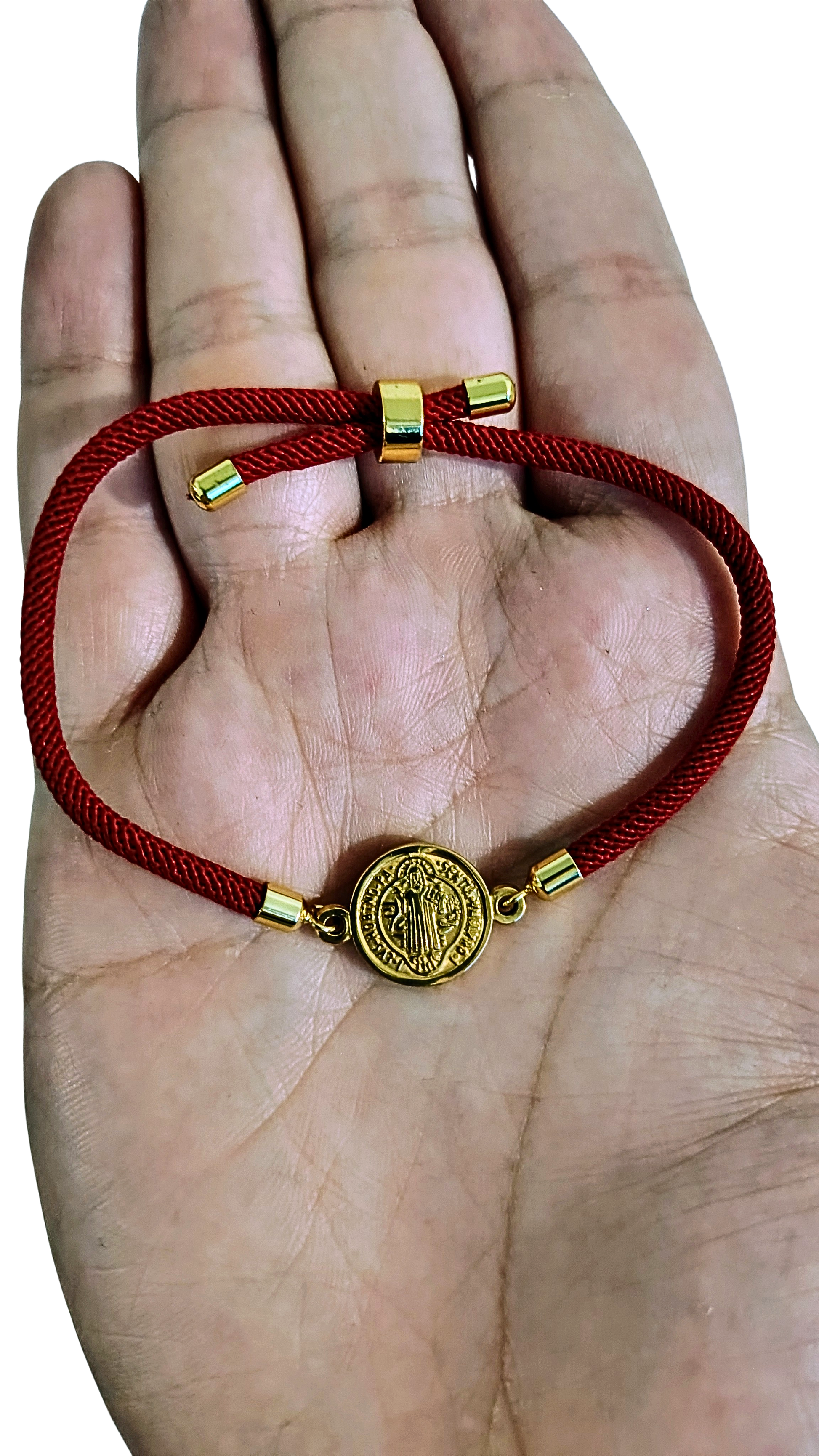 Pulsera tejida en hilo rojo con dije de San Benito en oro laminado 18K. Protección, energía y elegancia en una sola pieza.